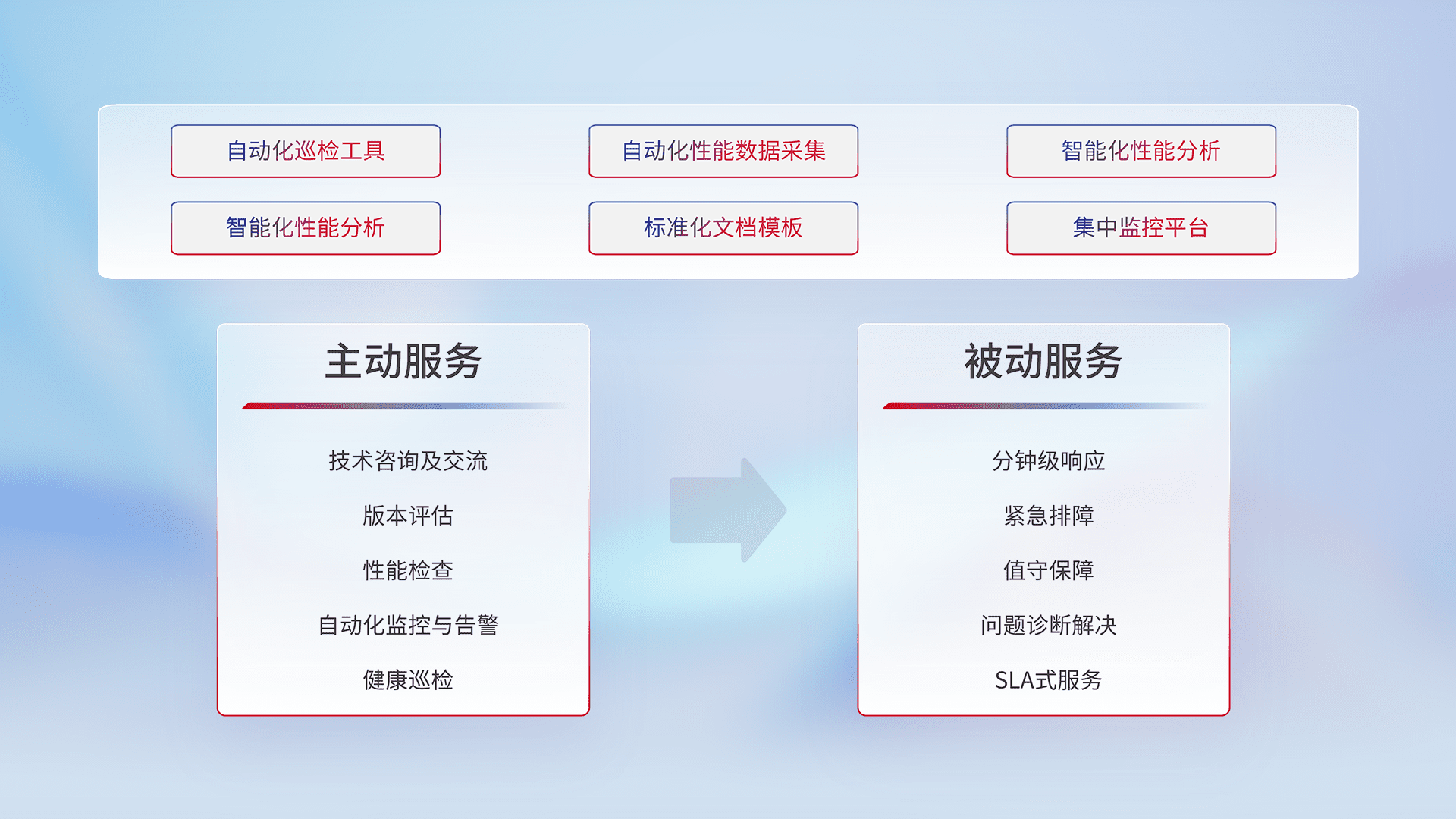 智能化工具和标准化文档,,,保障服务质量,,,,提供主动服务(包含技术咨询、、版本评估、、、、性能检查、、、、自动化监控与告警、、、、健康巡检)和被动服务包含(分钟级响应、、、紧急排障、、、、值守保障、、、、问题诊断解决、、SLA服务)。。。